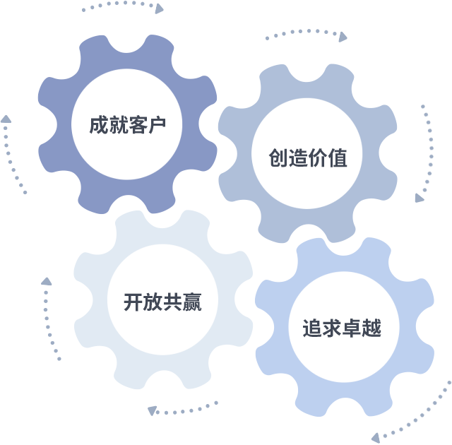成就客户是一切决策的出发点,,,创造价值是衡量所有工作的标准,,,追求卓越是我们做事做人的态度,,,,开放共赢是我们的格局也是最终的结果。。价值观的齿轮环环相扣,,推动着组织里的每个人不断向前。。。。